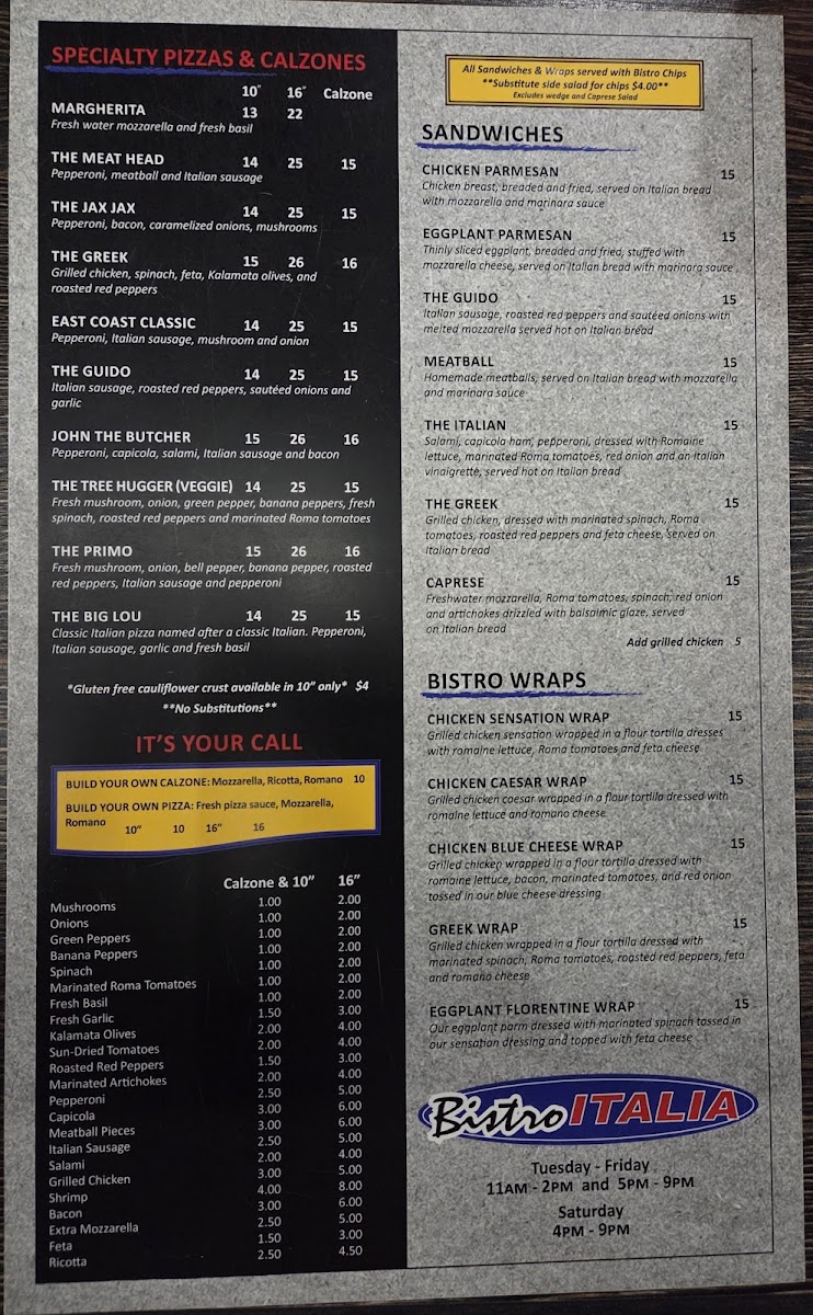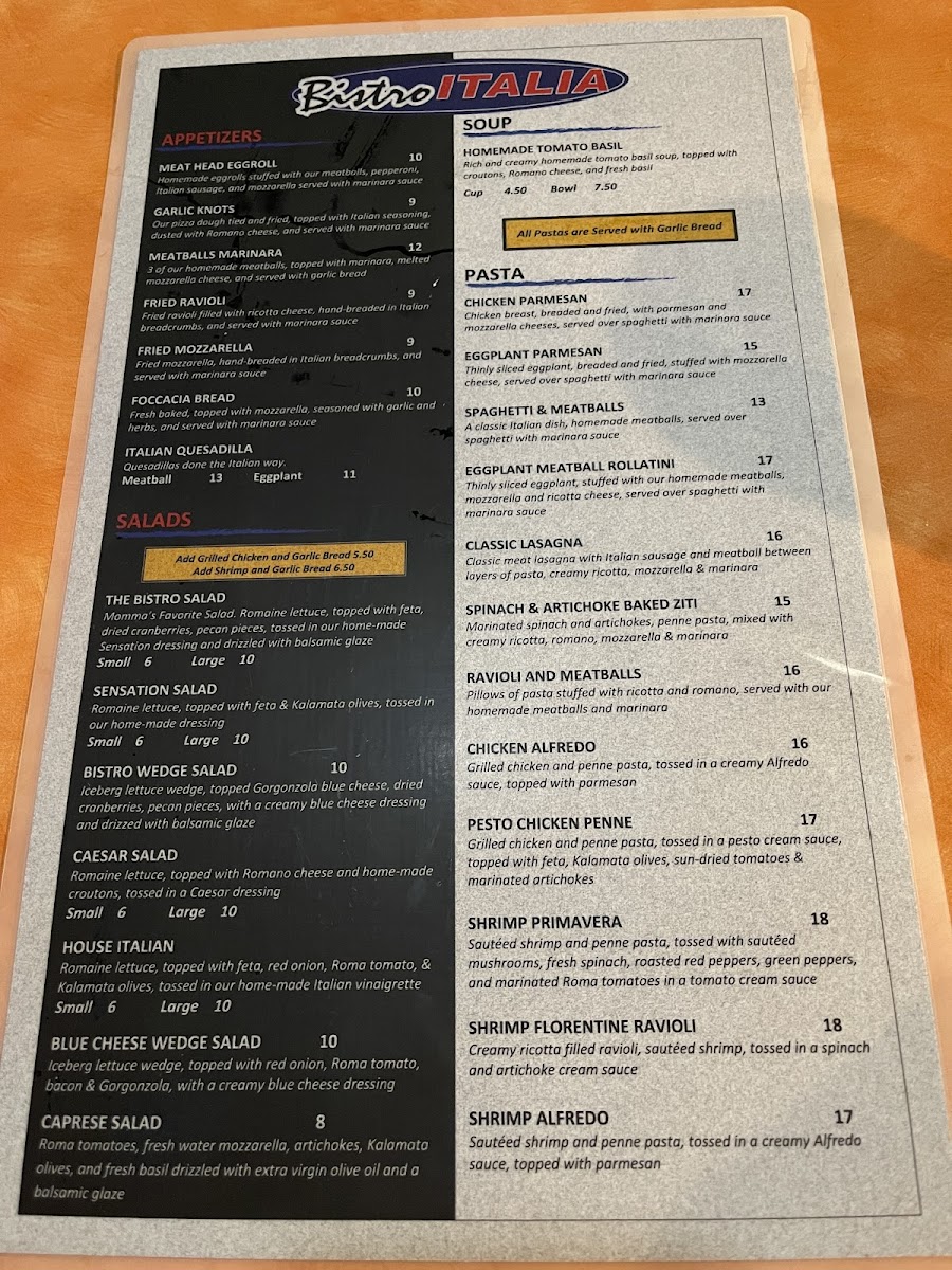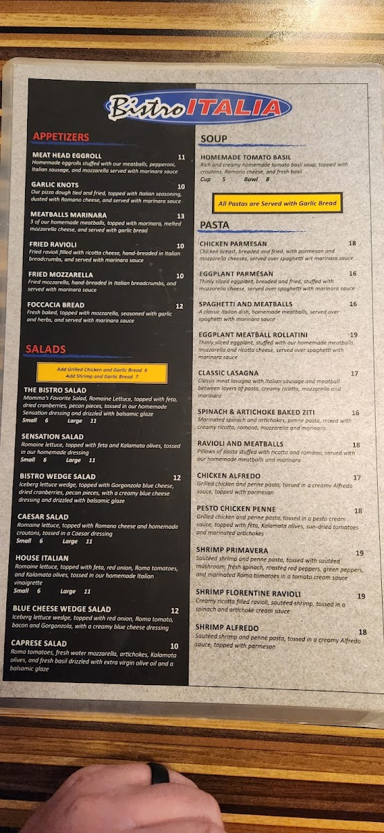 Bistro Italia specializes in an extensive range of Italian cuisine, crafted with love and authenticity. Dive into their delectable menu, where you'll find popular favorites like the Classic Lasagna, layered to perfection with ricotta and marinara that's bursting with flavor, and the Chicken Parmesan, featuring tender chicken fillets enveloped in a crispy golden crust. Don't miss their Shrimp Florentine Ravioli—plump raviolis oozing with fresh seafood and herbs—a delight for your taste buds!
