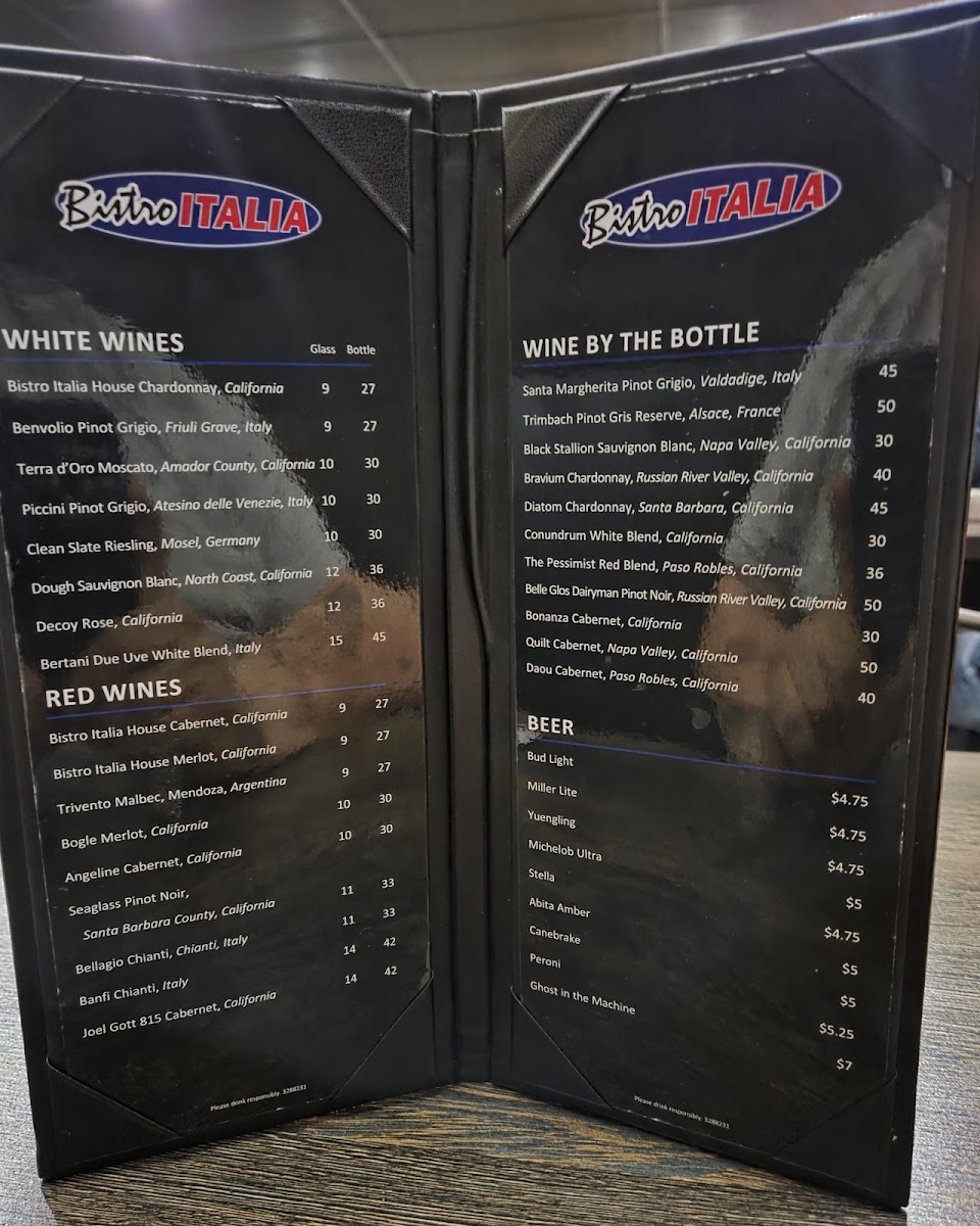Complement your meal with a selection from Bistro Italia's thoughtfully curated wine list, boasting options like the Bistro Italia House Cabernet or a crisp Piccini Pinot Grigio from Italy, perfect for pairing with any dish. With wines starting at just $9, you can easily elevate your dining experience.